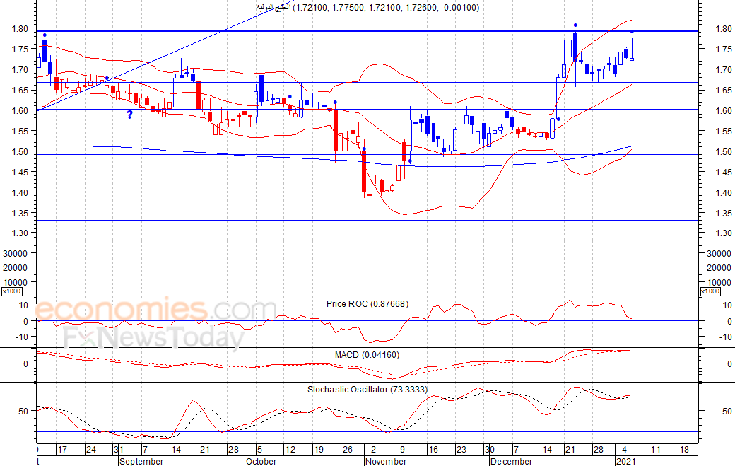 من المتوقع ان يكون النطاق السعري خلال جلسة اليوم بين مستوى الدعم وهو 1.70 وبين مستوى المقاومة هو 1.75 ريال