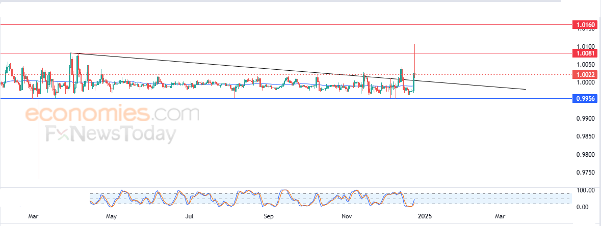 لذلك نحن نرجح ارتفاع سعر العملة خلال تداولتاه القادمة، خاصة في حالة اختراقه لمستوى المقاومة المحوري 1.0081$، ليستهدف بعدها مستوى المقاومة 1.0160$.