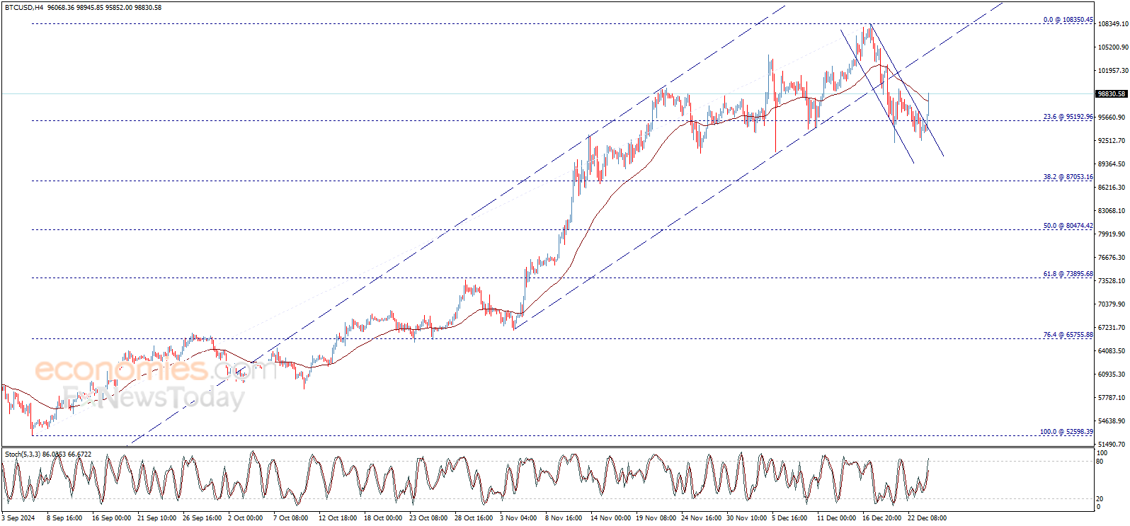 اندفع سعر البتكوين (BTCUSD) صعوداً بشكل قوي ليخترق مستوى 96555.00$ ويتجه نحو التحوّل إلى الارتفاع على المدى اللحظي والقصير، ليوقف التصحيح الهابط المقترح في تقاريرنا الأخيرة ويبني موجة صاعدة يتواجد هدفها الرئيسي التالي عند 105000.00$، مع الإشارة إلى أن الاتجاه الصاعد سيبقى قائماً ما لم يتم كسر مستوى 95195.00$ والثبات دونه من جديد.