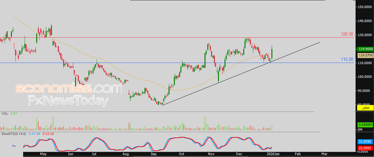 لذلك فتوقعاتنا تشير إلى صعود سعر السهم خلال تداولاته القادمة، طيلة ثبات مستوى الدعم 110.20 ريال، ليستهدف مستوى المقاومة المحوري 128.30 ريال استعداداً لمهاجمته.