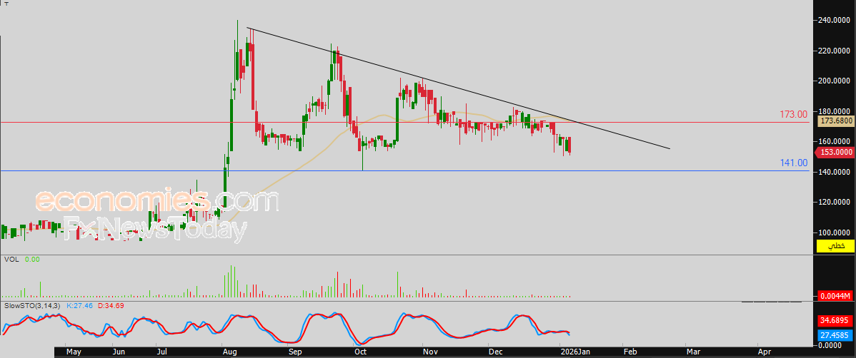 لهذا فتوقعاتنا تشير إلى انخفاض سعر السهم خلال تداولاته القادمة، طيلة ثبات مستوى المقاومة 173.00 دينار، ليستهدف مستوى الدعم المحوري 141.00 دينار.