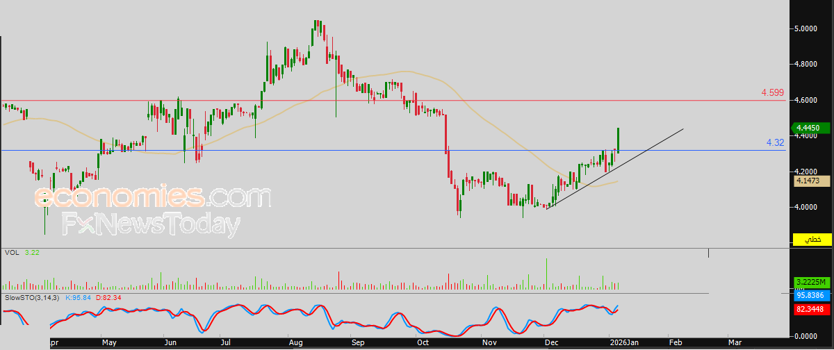 لهذا تشير توقعاتنا إلى صعود سعر السهم خلال تداولاته القادمة، طيلة استقراره اعلى سعر 4.32 ريال، ليستهدف أولى مستويات المقاومة عند سعر 4.599 ريال.