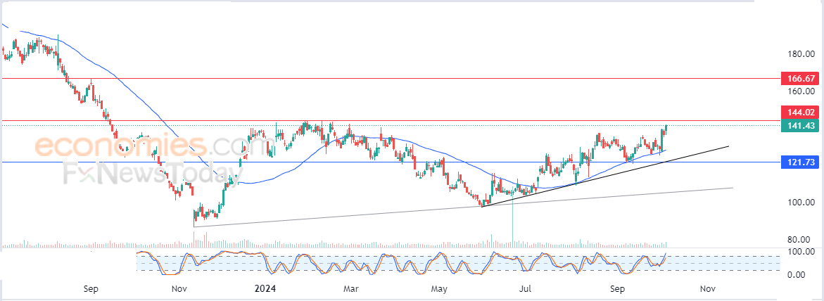 لذلك فتوقعاتنا تشير إلى المزيد من الصعود لسعر السهم خلال تداولاته القادمة، خاصة في حالة اختراقه لمستوى المقاومة المحوري 144.00$، ليستهدف بعدها أولى مستويات المقاومة عند سعر 166.70$.