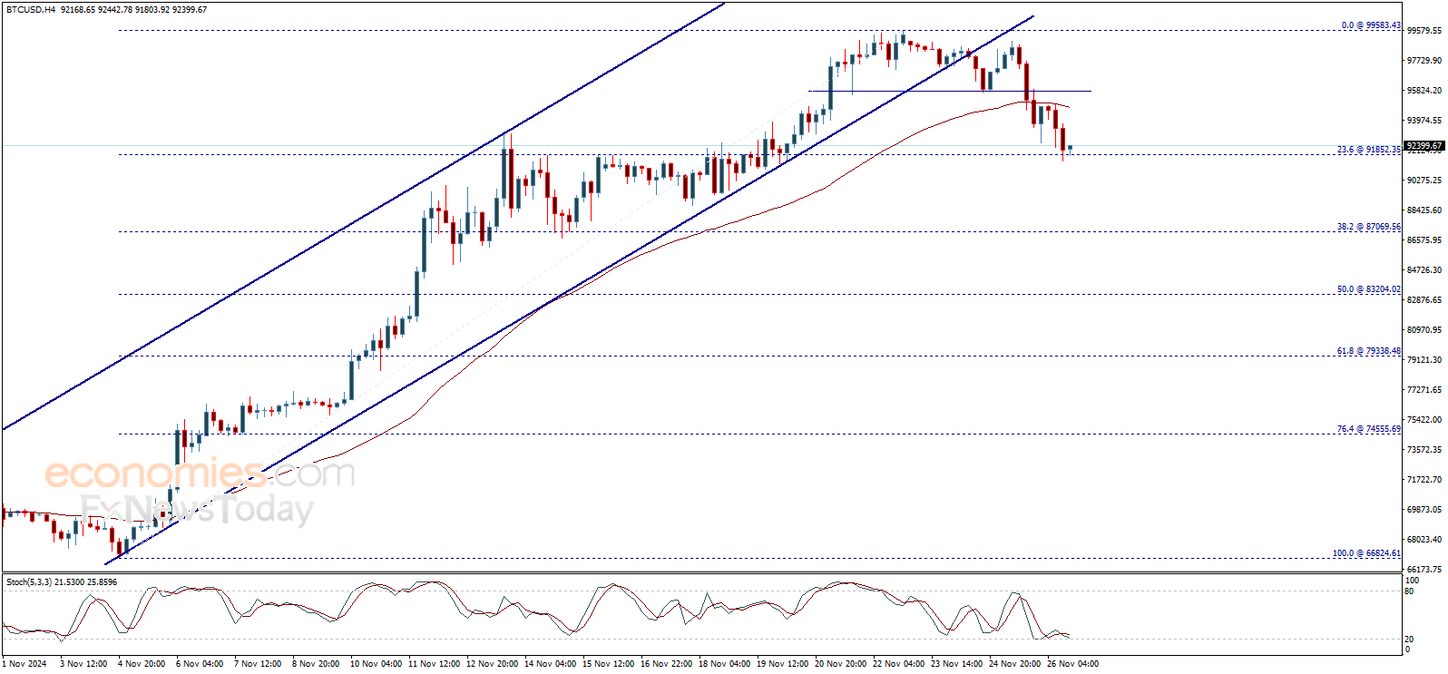 تمكّن سعر البتكوين (BTCUSD) من ملامسة هدفنا المنتظر عند 91855.00$ ويجد دعم قوي هناك، ونحتاج لمراقبة السعر الآن، حيث إن كسر هذا المستوى سيضغط على السعر لتحقيق أهداف سلبية إضافية تصل إلى 89410.00$ كمحطة سلبية تالية، في حين إن التماسك فوقه سيقود السعر لبدء محاولات تعافي وبناء موجة صاعدة تستهدف اختبار مستوى 95820.00$ بشكل رئيسي.