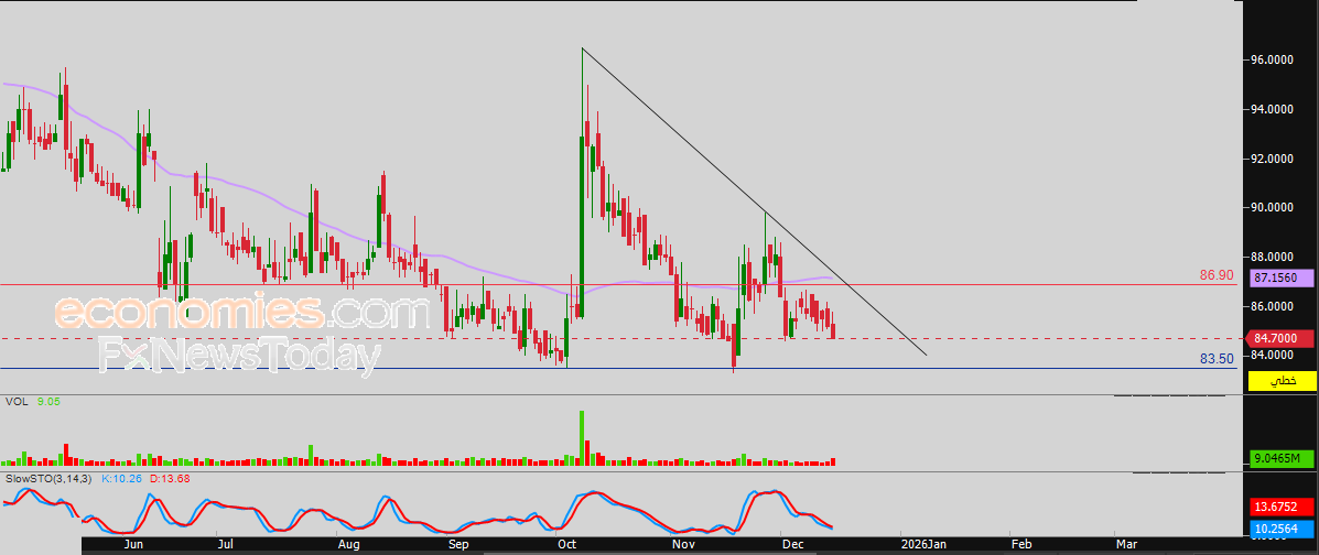 لهذا فتوقعاتنا تشير إلى هبوط سعر السهم خلال تداولاته القادمة، طيلة ثبات مستوى المقاومة 86.90 دينار، ليستهدف مستوى الدعم المحوري 83.50 دينار.