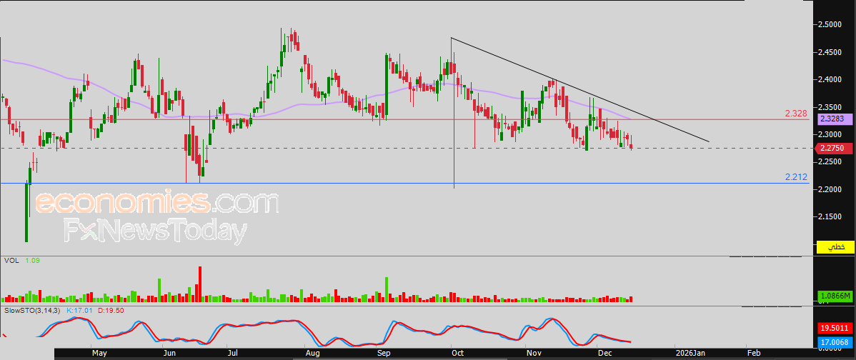 لذلك فتوقعاتنا تشير إلى هبوط سعر السهم خلال تداولاته القادمة، طيلة ثبات مستوى المقاومة 2.328 ريال، ليستهدف مستوى الدعم المحوري 2.212 ريال.