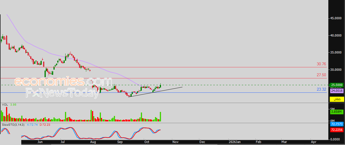 لهذا تشير توقعاتنا إلى ارتفاع سعر السهم خلال تداولاته القادمة، طيلة ثبات مستوى الدعم 23.32 ريال، ليستهدف مستوى المقاومة المحوري 27.50 ريال استعداداً لمهاجمته.