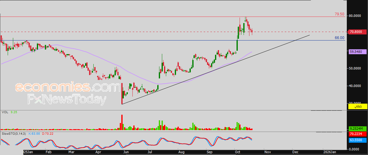 لهذا فتوقعاتنا تشير إلى صعود سعر السهم خلال تداولاته القادمة، طيلة ثبات مستوى الدعم 66.00 دينار، ليستهدف مستوى المقاومة المهم 79.50 دينار.