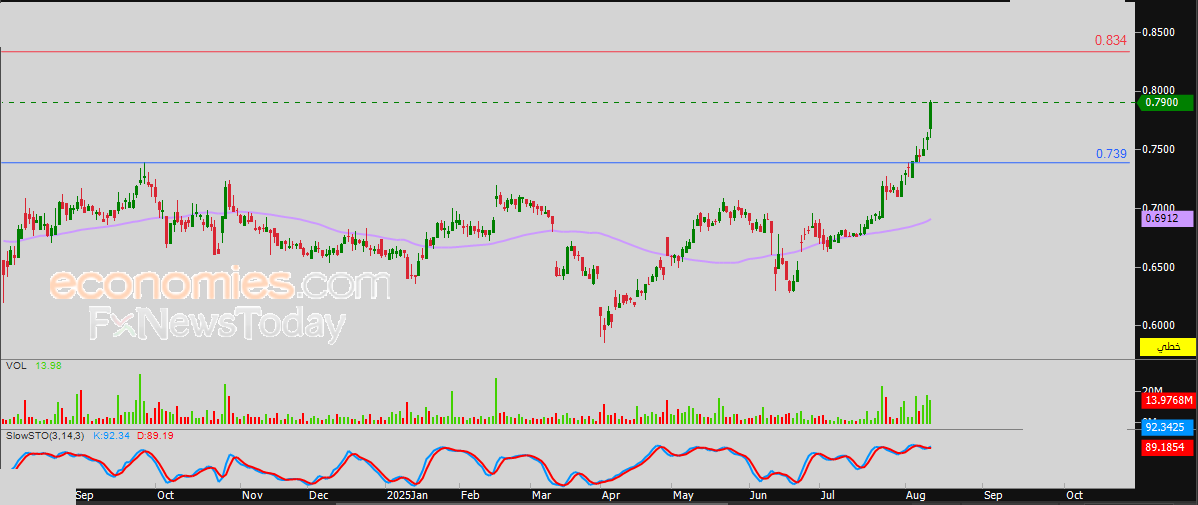 لذلك فتوقعاتنا تشير إلى استمرار صعود سعر السهم خلال تداولاته القادمة، طيلة ثبات الدعم 0.739 ريال، ليستهدف مستوى المقاومة 0.834 ريال.