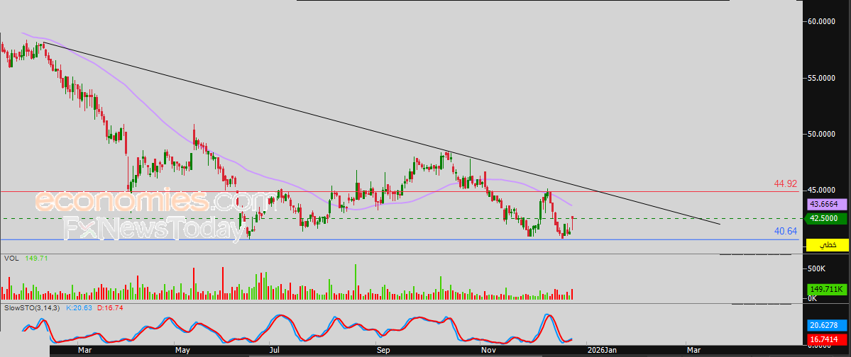 لهذا فتوقعاتنا تميل نحو هبوط سعر السهم خلال تداولاته القادمة، طيلة ثبات مستوى المقاومة 44.90 ريال، ليستهدف من جديد مستوى الدعم المذكور 40.64 ريال.
