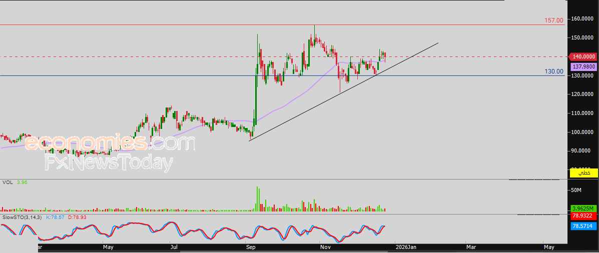 لهذا فتوقعاتنا تشير إلى ارتفاع سعر السهم خلال تداولاته القادمة، طيلة ثبات مستوى الدعم 130.00 دينار، ليستهدف مستوى المقاومة المحوري 157.00 دينار.