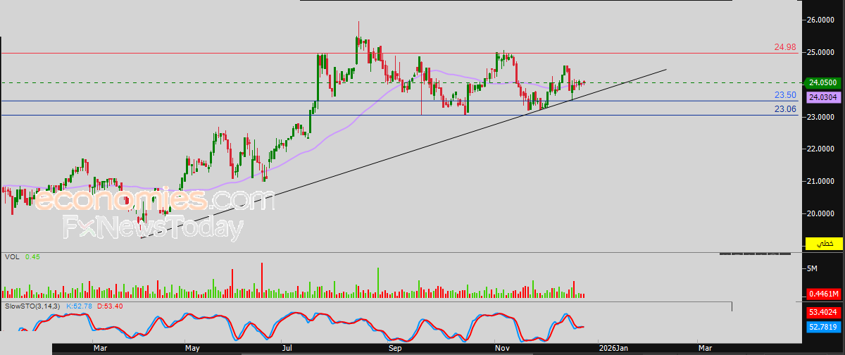 لذلك تشير توقعاتنا إلى صعود سعر السهم خلال تداولاته القادمة، طيلة ثبات مستوى الدعم 23.50 ريال، ليستهدف مستوى المقاومة المحوري 25.00 ريال.