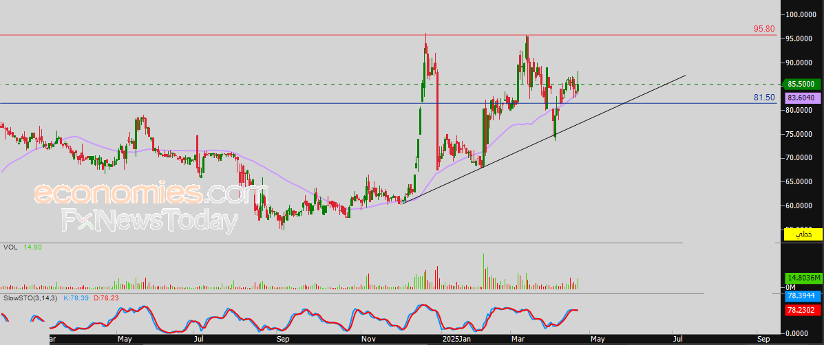 لذلك نحن نتوقع المزيد من الصعود لسعر السهم خلال تداولاته القادمة، طيلة ثبات مستوى الدعم 81.50 دينار، ليستهدف مستوى المقاومة المحوري 95.80 دينار.
