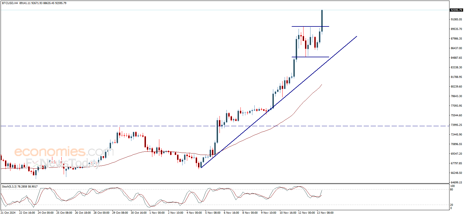 عاد سعر البتكوين (BTCUSD) للاندفاع الصاعد بشكل قوي ليخترق مستوى 89920.00$ ويحقق مستويات تاريخية جديدة، وتجاوز حاجز 92000.00$ دولار ليفتح الطريق أمام تحقيق مزيد من المكاسب المتوقعة خلال الفترة القادمة، مع الإشارة إلى أن المحطة التالية تصل إلى 94000.00$، بينما يمثّل الثبات فوق 89920.00$ شرط مهم لاستمرار الاندفاع الصاعد الحالي.
