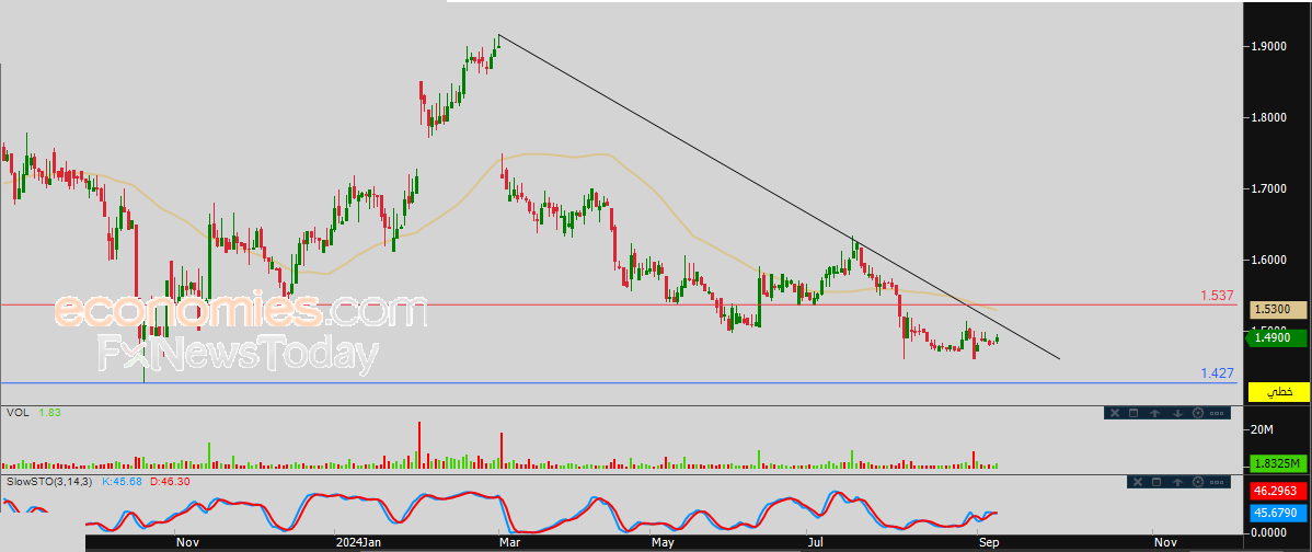لذلك نحن نرجح عودة هبوط سعر السهم خلال تداولاته القادمة، طيلة ثبات مستوى المقاومة 1.537، ليستهدف مستوى الدعم المحوري 1.427.