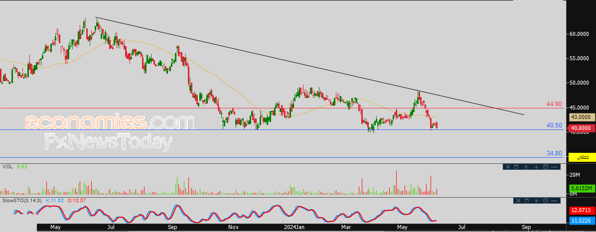 لهذا فتوقعاتنا تشير إلى المزيد من الهبوط لسعر السهم خلال تداولاته القادمة، خاصة في حالة كسره لمستوى الدعم المحوري 40.50، ليستهدف بعدها مستوى الدعم 34.80.