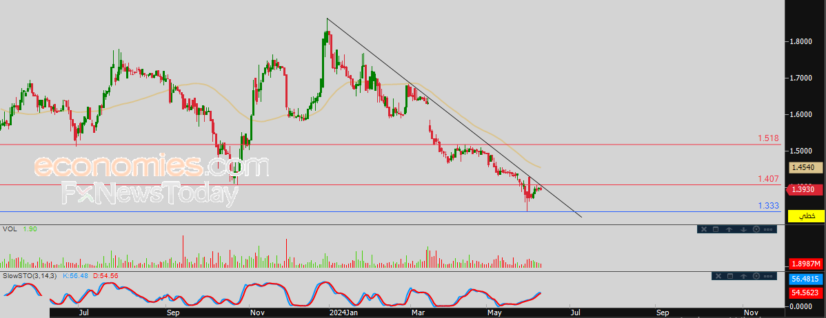 لذلك نحن نتوقع المزيد من الانخفاض لسعر السهم خلال تداولاته القادمة، طيلة استقراره دون مستوى المقاومة 1.407، ليستهدف مستوى الدعم 1.333.