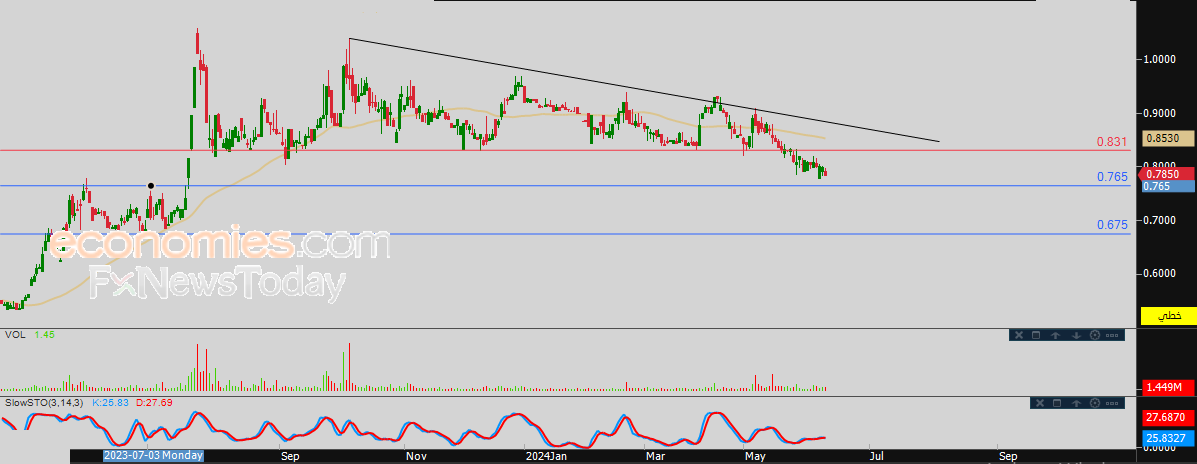لذلك نحن نتوقع المزيد من الهبوط لسعر السهم خلال تداولاته القادمة، طيلة ثبات المقاومة 0.831، ليستهدف أولى مستويات الدعم عند 0.765.