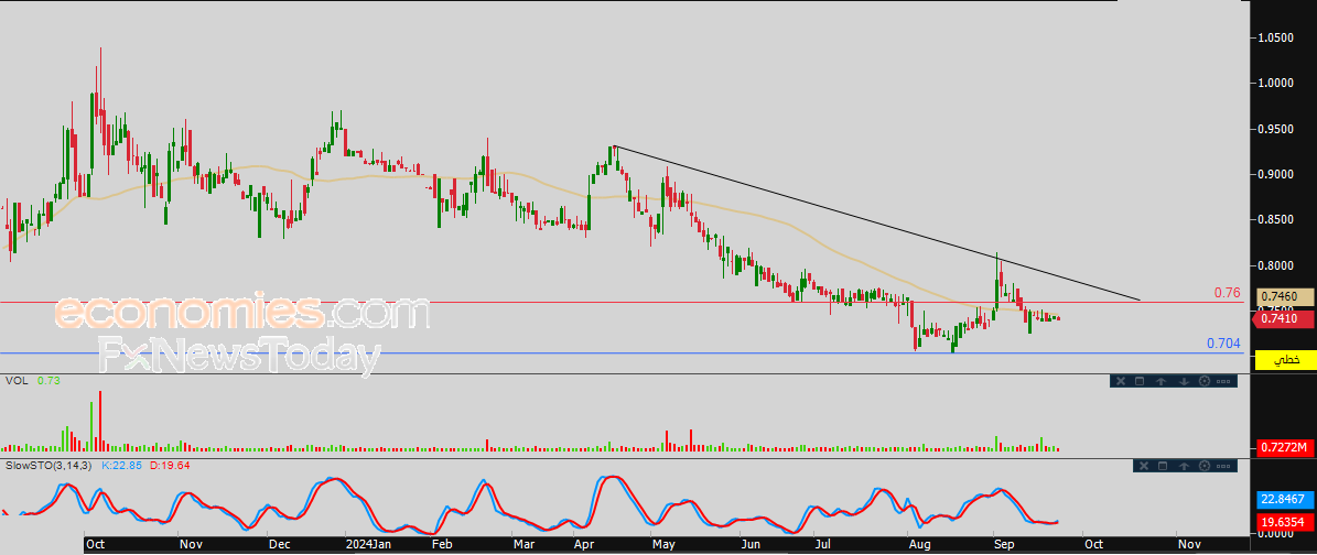 لذلك فتوقعاتنا تشير إلى المزيد من الهبوط لسعر السهم خلال تداولاته القادمة، طيلة استقراره دون مستوى المقاومة 0.76، ليستهدف مستوى الدعم المحوري 0.704.