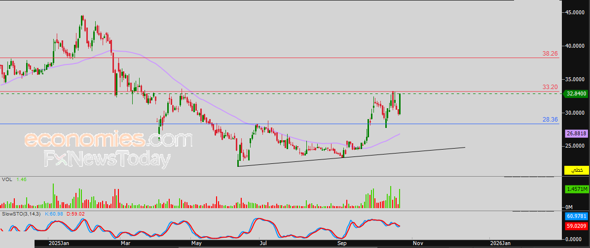 لذلك فتوقعاتنا تشير إلى صعود سعر السهم خلال تداولاته اللحظية القادمة، خاصة في حالة اختراقه للمقاومة المذكورة 33.20 ريال، ليستهدف بعدها مقاومته التالية عند سعر 38.26 ريال.