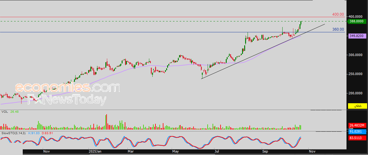 لذلك فتوقعاتنا تشير إلى صعود سعر السهم خلال تداولاته القادمة، ليستهدف مستوى المقاومة الرئيسي والقريب 400.00 دينار، مع وجود فرص لاختراقه.