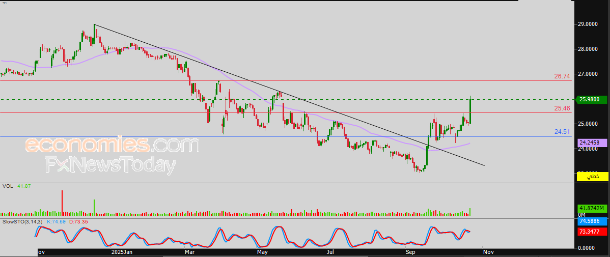 لهذا فتوقعاتنا تشير إلى صعود سعر السهم خلال تداولاته القادمة، خاصة طيلة استقراره اعلى سعر 25.46 ريال، ليستهدف مستوى المقاومة التالي عند سعر 26.74 ريال.