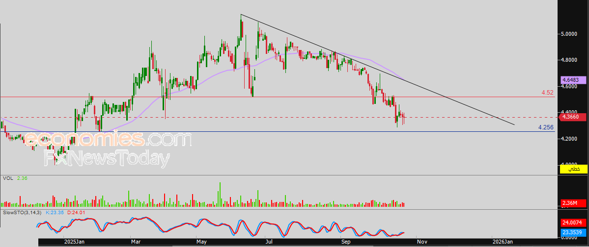 لذلك فتوقعاتنا تشير إلى هبوط سعر السهم خلال تداولاته القادمة، طيلة ثبات مستوى المقاومة 4.52 ريال، ليستهدف أولى مستويات الدعم عند سعر 4.256 ريال.