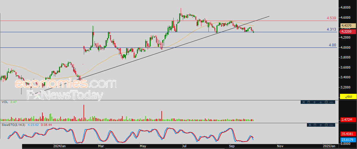 لذلك تشير توقعاتنا إلى المزيد من الانخفاض لسعر السهم خلال تداولاته القادمة، خاصة في حالة كسره لمستوى الدعم 4.313، ليستهدف بعدها مستوى الدعم 4.00.