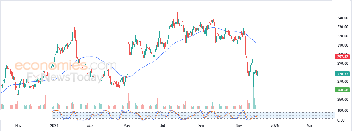 لذلك نحن نرجح عودة هبوط سعر السهم خلال تداولاته القادمة، طيلة ثبات مستوى المقاومة 297.32$، ليستهدف مستوى الدعم المحوري 260.68$.