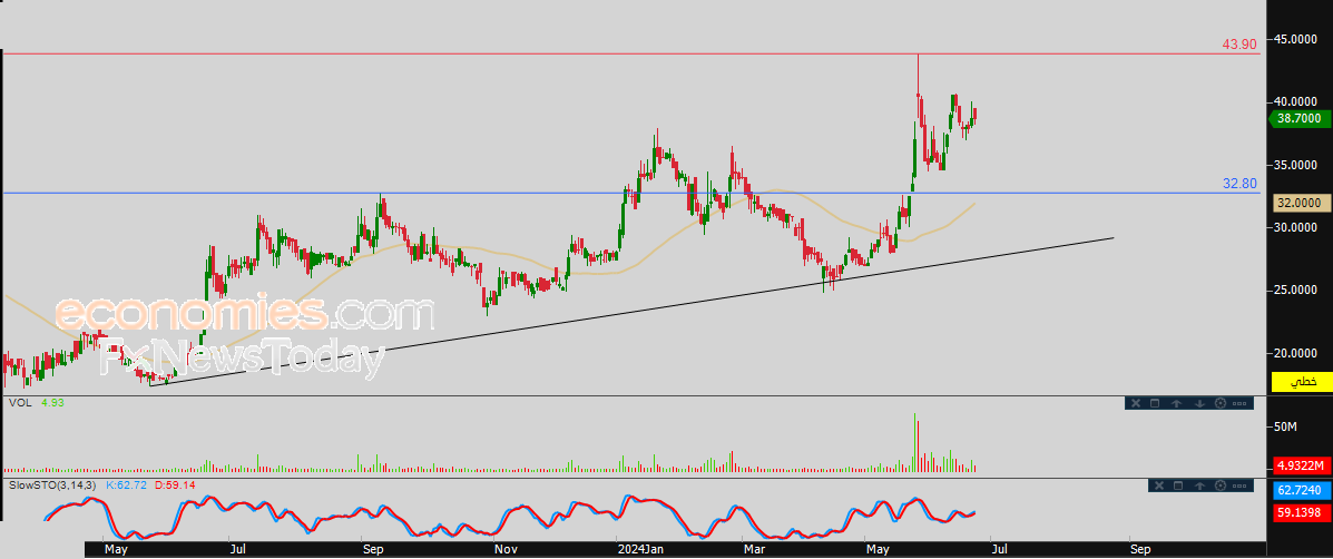 لهذا تشير توقعاتنا إلى ارتفاع سعر السهم خلال تداولاته القادمة، طيلة ثبات مستوى الدعم 36.50، ليستهدف مستوى المقاومة المحوري 43.90.