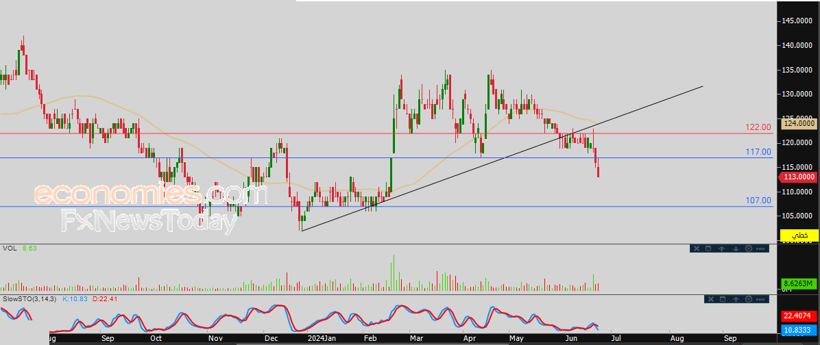 لذلك نحن نتوقع استمرار هبوط سعر السهم خلال تداولاته القادمة، خاصة طوال استقراره دون مستوى 117.00، ليستهدف مستوى الدعم 107.00.