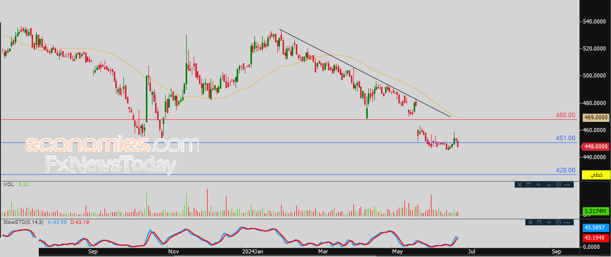 لذلك نحن نتوقع المزيد من الهبوط لسعر السهم خلال تداولاته القادمة، طيلة استقراره دون مستوى 451.00، ليستهدف مستوى الدعم 428.00.