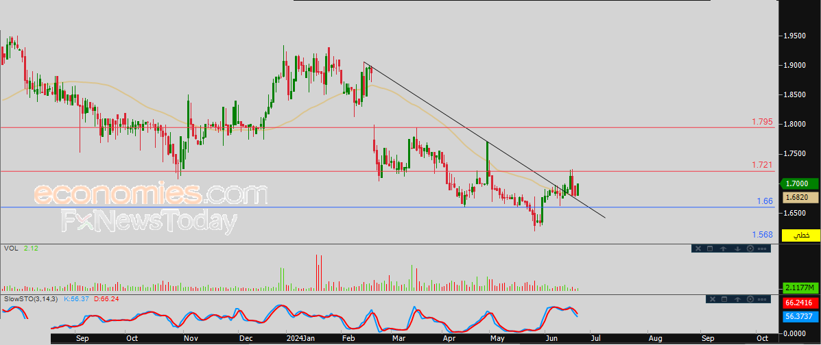 لذلك نحن نتوقع المزيد من الصعود لسعر السهم خلال تداولاته القادمة، طيلة ثبات مستوى الدعم 1.66، ليستهدف أولى مستويات المقاومة عند سعر 1.721.