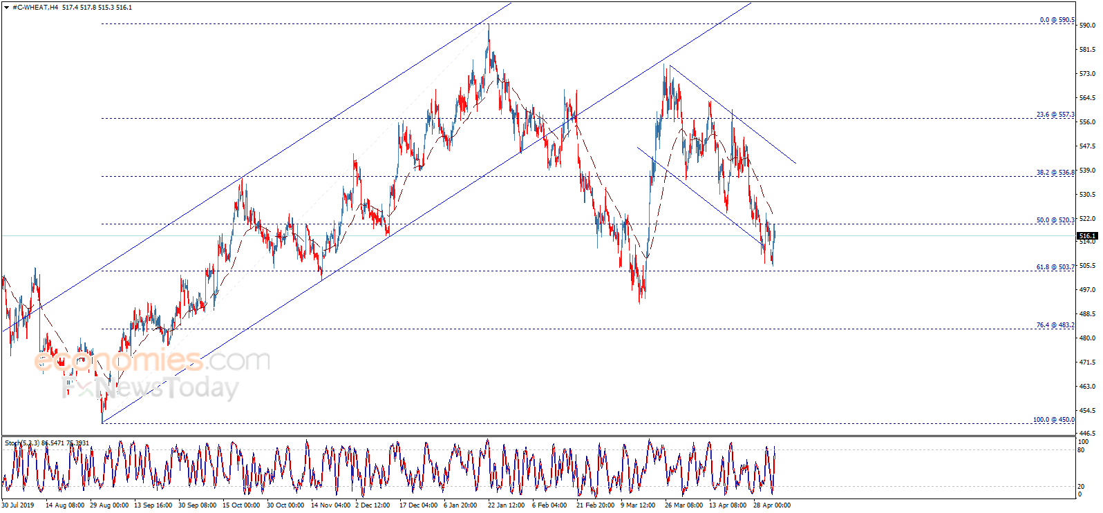 اندفع سعر القمح صعوداً بشكل قوي يوم أمس ليختبر المقاومة المحورية 520.30، وحافظ على ثباته دونها ليبدأ بالارتداد هبوطاً الآن، مما يبقي على توقعاتنا للاتجاه الهابط فعالة على المدى اللحظي والقصير، بانتظار زيارة مستوى 503.70 كهدف رئيسي تالي.