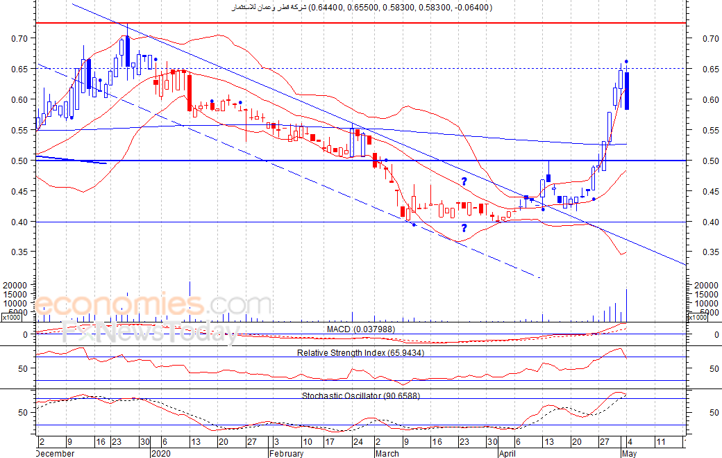 لامس السهم هدفه السعري المتوقع عند 0٫65 ريال، والذي اشرنا اليه في تقاريرنا السابقة والذي يعد مستوى المقاومة الحالي، حيث اغلق عند مستوى 0٫583 ريال، مصحوبا بارتفاع في كمية التداول، كما كون السهم نموذج "Bearish Engulfing” وهو من الشموع اليابانية العاكسة للاتجاه الصاعد، لذلك نتوقع ان يشهد السهم عمليات جني أرباح قد تهبط به لمستوى الدعم 0٫65 ريال، شرط بقاء السهم اسفل مستوى 0٫66 ريال.