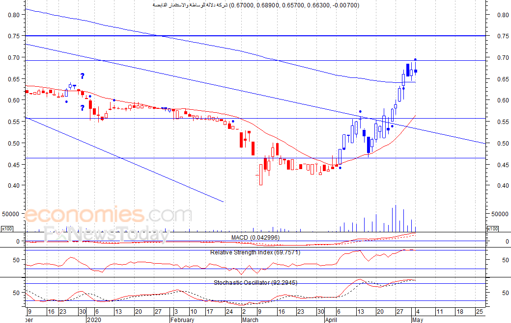 أنهى السهم تداولات امس الاثنين منخفضا عند مستوى 0٫663 ريال، وذلك بعدما تلقى مقاومة عند مستوى 0٫69 ريال، كما نلاحظ انطلاق إشارة بيع على مؤشر القوة النسبية، لذلك نتوقع ان يشهد السهم عمليات جني أرباح قد تهبط به لمستوى الدعم 0٫56 ريال، شرط بقاء السهم اسفل مستوى 0٫70 ريال.