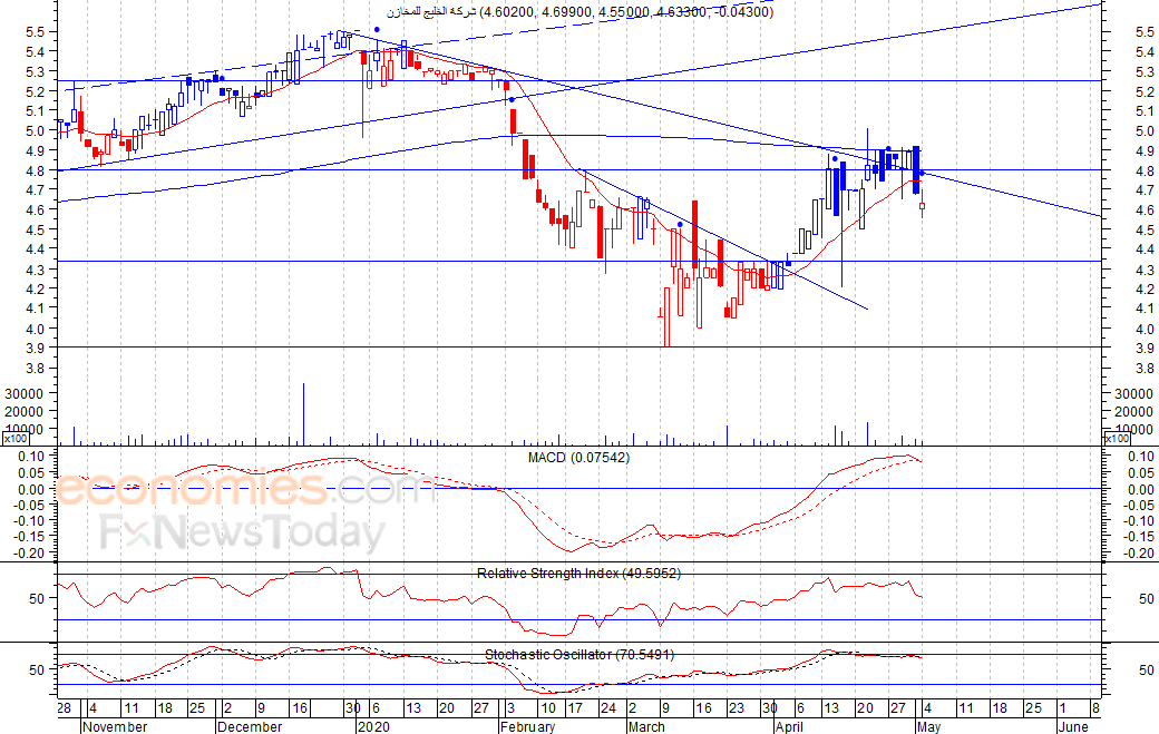 من المتوقع ان يكون النطاق السعري خلال جلسة اليوم بين مستوى الدعم وهو 4.51 وبين مستوى المقاومة هو 4.68 ريال