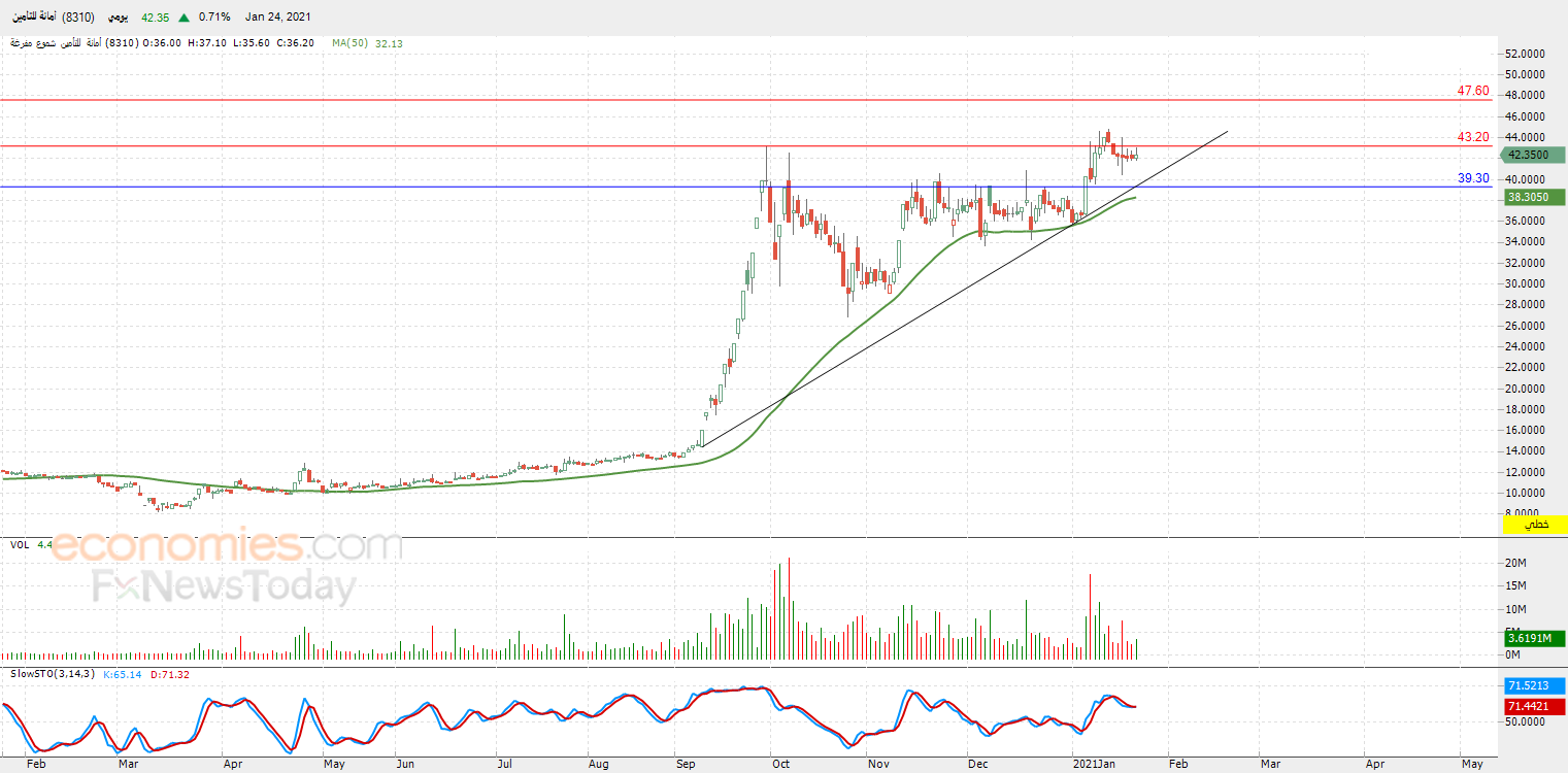 ارتفع قليلاً سهم أمانة للتأمين (8310) في آخر جلساته، ليهاجم السهم من جديد مستوى المقاومة المحوري 43.20، وذلك وسط سيطرة الاتجاه الرئيسي الصاعد على المدى المتوسط بمحاذاة خط ميل، مع تواصل الضغط الإيجابي لتداولاته أعلى متوسطه المتحرك البسيط لفترة 50 يوماً السابقة، ليحقق مكاسب بلغت نسبتها 0.71% بما يعادل 0.30 نقطة، أمام توارد الإشارات السلبية بمؤشرات القوة النسبية، ليحاول السهم تصريف تشبعه الشرائي الذي كان واضحاً بها في السابق.
