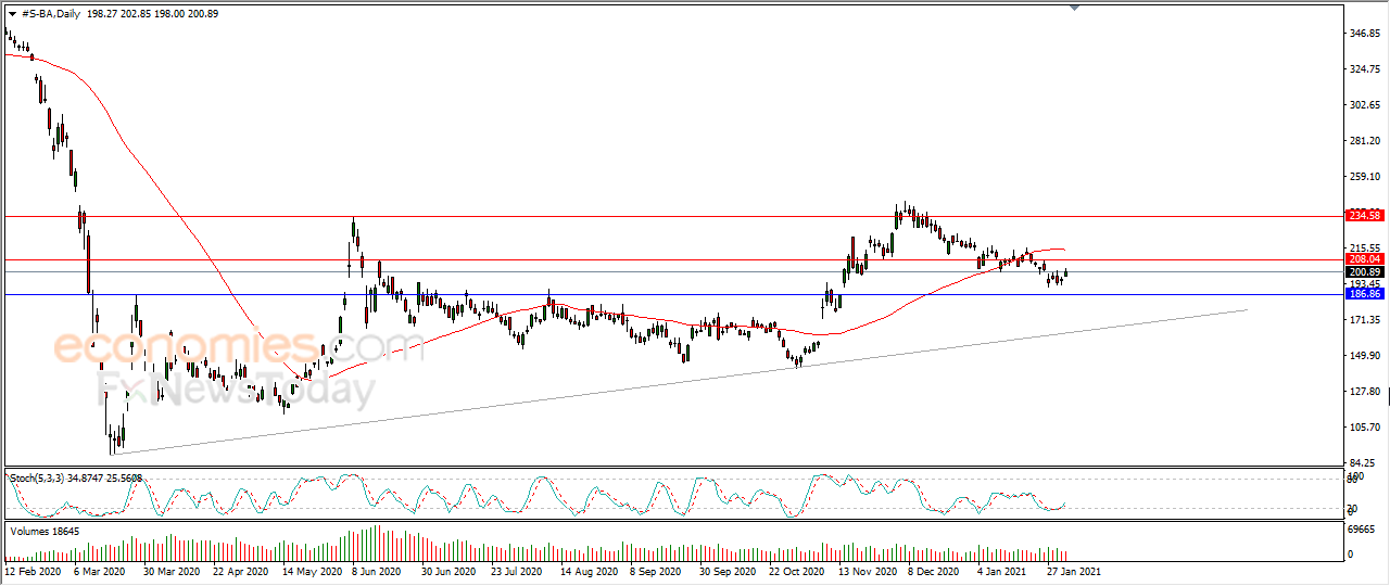 صعد سهم شركة بوينج (BA) في آخر جلساته، وسط استمرار الضغط السلبي لتداولاته دون المتوسط المتحرك البسيط لفترة 50 يوماً السابقة، وتحت سيطرة موجة تصحيحية هابطة على المدى القصير، ليحقق السهم مكاسب حذرة بلغت نسبتها 2.60% بما يعادل 5.10 نقطة ليستقر على سعر 200.94 دولار، ليحاول السهم بهذا الارتفاع تعويض جزء من خسائره السابقة، وفي الوقت نفسه يحاول تصريف البعض من تشبعه البيعي الواضح بمؤشرات القوة النسبية، خاصة مع بدء توارد الإشارات الإيجابية منها.