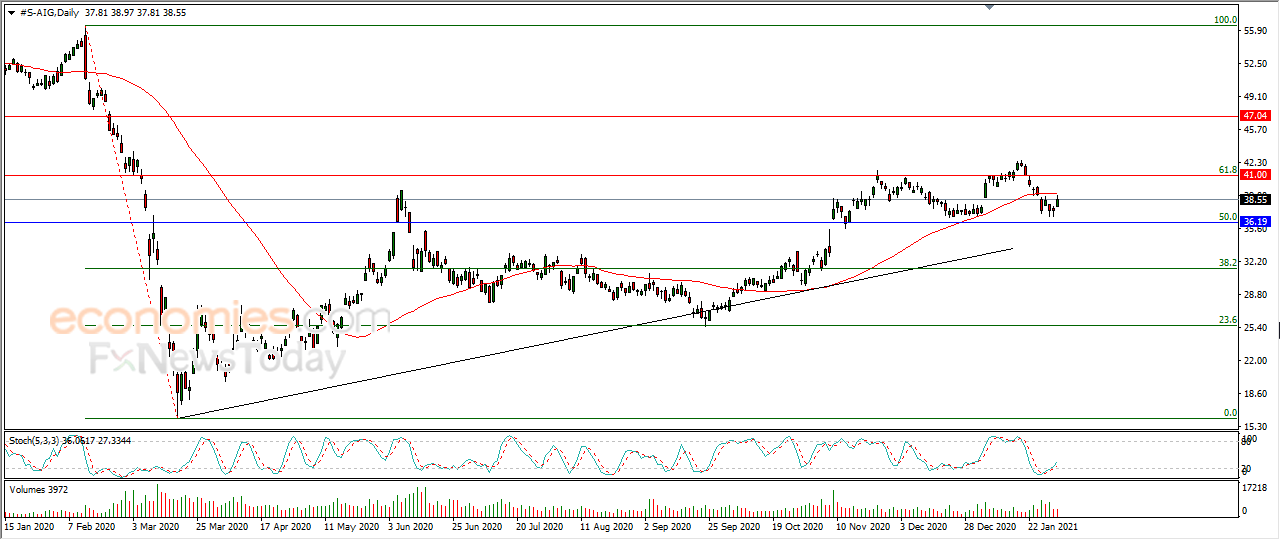 ارتفع سهم أمريكان إنترناشيونال جروب (AIG) بتداولاته الأخيرة على المستويات اللحظية، وذلك وسط استقرار تداولاته أعلى مستوى 36.19، فهذا المستوى يمثل نسبة 50% من مستويات فيبوناتشي التصحيحية لآخر موجة هابطة على المدى المتوسط (من 56.38 إلى 16.05)، مع بدء توارد الإشارات الإيجابية بمؤشرات القوة النسبية، بعد وصولها لمناطق شديدة التشبع بعمليات البيع، ليحاول السهم بهذا الارتفاع التخلص من الضغط السلبي للمتوسط المتحرك البسيط لفترة 50 يوماً السابقة، محققاً مكاسب في آخر جلساته بنسبة بلغت 3.07% بما يعادل 1.15 نقطة ليستقر في نهاية التداولات على سعر 38.57 دولار.