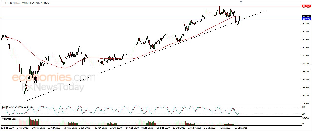 صعد سهم ستاربكس (SBUX) بتداولاته الأخيرة على المستويات اللحظية، وذلك وسط سيطرة الاتجاه الرئيسي الصاعد على المدى المتوسط بمحاذاة خط ميل، ومع بدء توارد الإشارات الإيجابية بمؤشرات القوة النسبية، بعد وصولها لمناطق شديدة التشبع بعمليات البيع، ليحقق السهم مكاسب جديدة في آخر جلساته بنسبة بلغت 3.11% بما يعادل 3.07 نقطة ليستقر على سعر 101.65 دولار، ليحاول السهم بارتفاعه الأخير التخلص من الضغط السلبي للمتوسط المتحرك البسيط لفترة 50 يوماً السابقة.