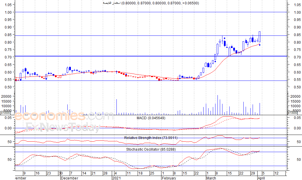 تمكن السهم من الارتفاع مرة أخرى ليغلق امس الاحد عند مستوى 0.87 ريال، وهو اعلى مستوى يصل اليه السهم في ثلاث سنوات، كما تمكن السهم من تجاوز مستوى مقاومته السابق عند 0.84 ريال، وهو ما يفتح الباب امام السهم لمزيد من الارتفاع لمستوى المقاومة التالي عند 1 ريال، شرط بقاء السهم اعلى مستوى 0.80 ريال.
