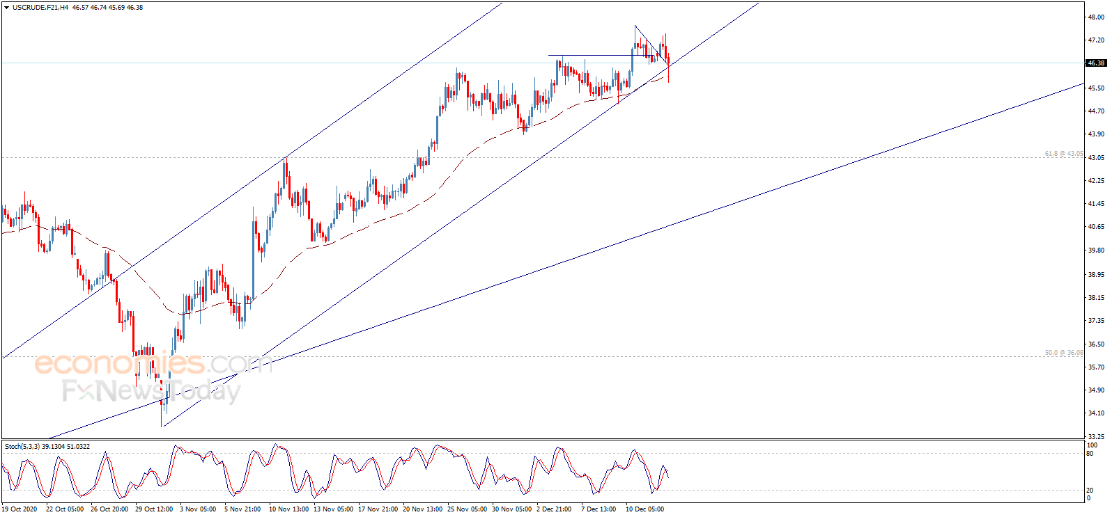يواجه سعر النفط ضغط سلبي قوي ليهاجم دعم القناة الصاعدة، مما يتطلب الانتباه من التداولات القادمة، حيث إن كسر 46.00 سيوقف السيناريو الإيجابي المقترح في تقاريرنا الأخيرة ويدفع السعر للتحول نحو الانخفاض، بينما ننتظر استئناف الموجة الصاعدة التي تواجد هدفها التالي عند 48.00.