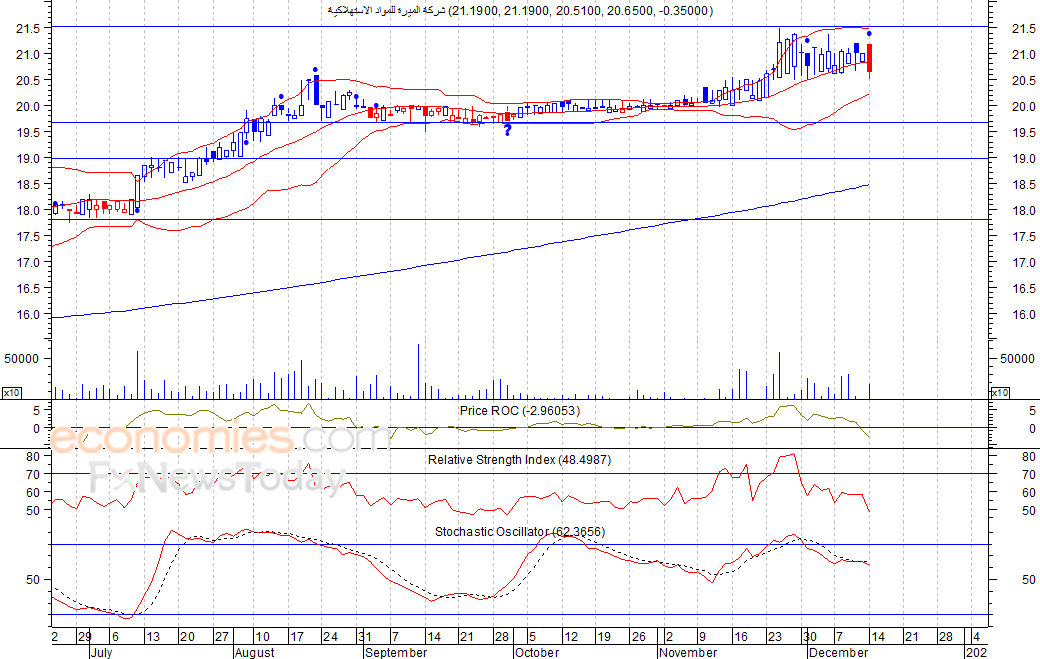 من المتوقع ان يكون النطاق السعري خلال جلسة اليوم بين مستوى الدعم هو 20.10 ريال وبين مستوى المقاومة هو 21.06 ريال