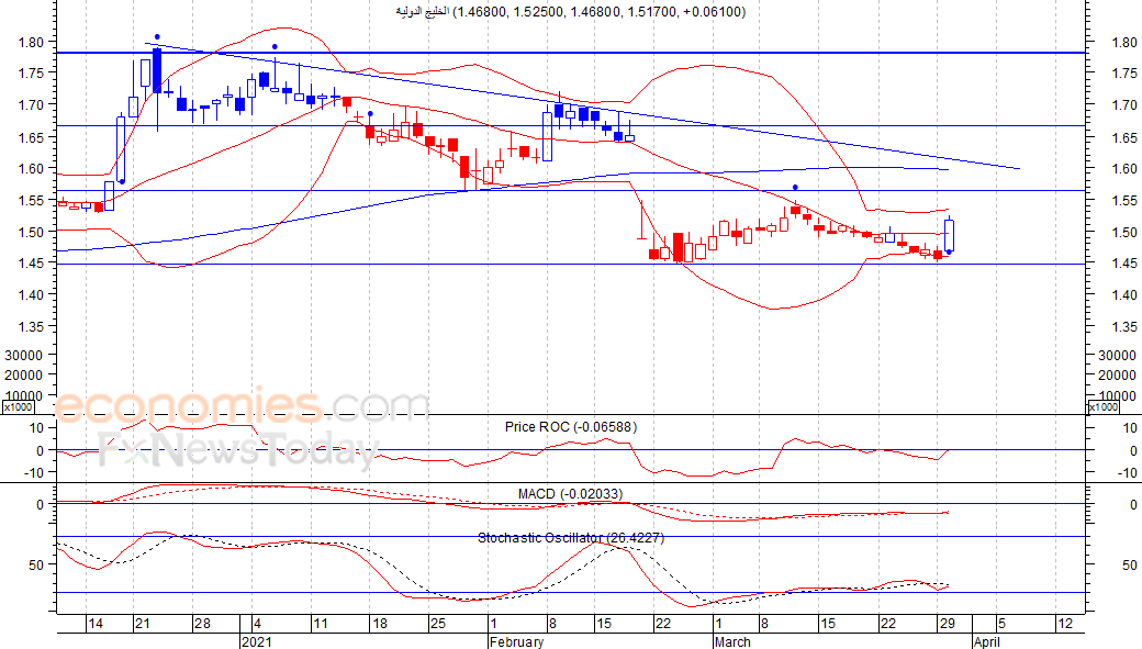 عوض السهم خسائره التي حققها خلال الاسبوع الماضيين، حيث اغلق امس الاربعاء مرتفعا عند مستوى 1.517 ريال، بالتزامن مع انطلاق اشارة شراء على مؤشر ماكد، مما يدفعنا بالقول بان السهم قد يشهد مزيدا من الارتفاع لمستوى المقاومة 1.57 ريال كمستوى اول ثم 1.66 ريال كمستوى ثان، شرط بقاء السهم اعلى مستوى 1.45 ريال.