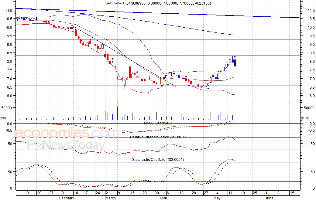 استهل السهم تداولات الخميس الماضي مرتفعا عند مستوى 8٫089 ريال، الا انه اغلق في المنطقة الحمراء، حيث اغلق عند مستوى 7٫70 ريال، وبالتزامن مع انطلاق إشارة بيع على مؤشر القوة النسبية، لذلك نتوقع ان يشهد السهم تراجعا لمستويات قد تصل الى 7٫40 ريال كمستوى أول ثم 6٫50 ريال كمستوى ثان، شرط بقاء السهم اسفل مستوى 8٫30 ريال.