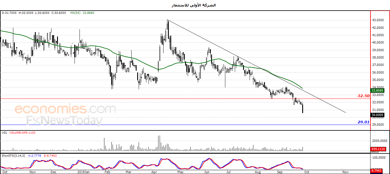 لهذا تشير توقعاتنا إلى المزيد من الانخفاض للسهم خلال تداولاته القادمة ، ليستهدف مستوى الدعم 29.00 ، طيلة ثبات المقاومة 32.50 .