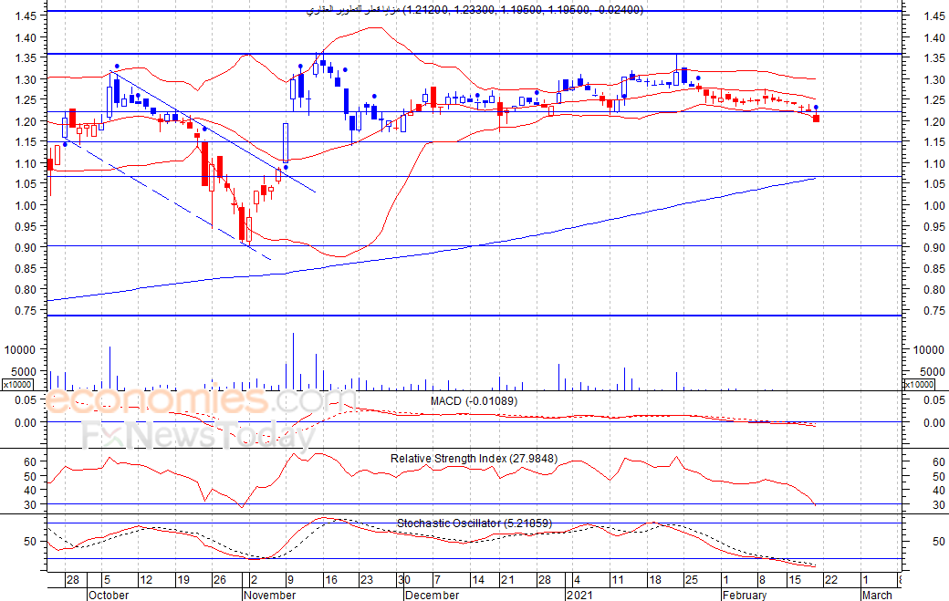 هبط السهم خلال جلسة امس الأحد اولى جلسات الأسبوع الحالي، حيث اغلق عند مستوى 1.195 ريال، مخترقا بذلك مستوى الدعم السابق عند 1.22 ريال، مما يعكس حالة التشاؤم لدى المتداولين، لذلك نتوقع استمرار الانخفاض لمستويات قد تصل الى 1.15 ريال كمستوى أول ثم 1.06 ريال كمستوى ثان، شرط بقاء السهم اسفل مستوى 1.25 ريال.