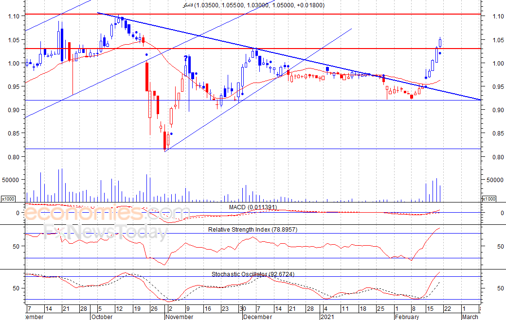 تمكن السهم من الارتفاع كما توقعنا في تقريرنا الاخير، حيث اغلق عند مستوى 1.05 ريال، متجاوزا بذلك هدفه السعري الأول عند 1.03 ريال، والذي يعد مستوى مقاومته السابق، وهو ما يفتح الباب أمام السهم لمزيد من الارتفاع للوصول للهدفه السعري الثاني عند 1.10 ريال، شرط بقاء السهم أعلى مستوى 1.03 ريال.