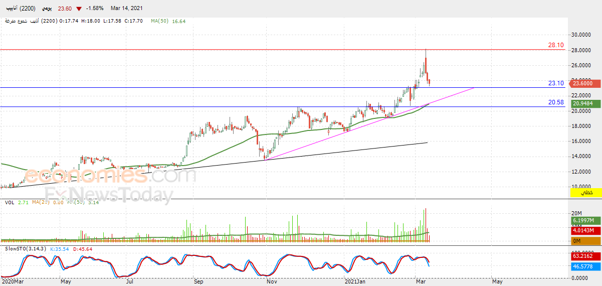 انخفض سهم أنابيب (2200) في آخر جلساته، وسط توارد الإشارات السلبية بمؤشرات القوة النسبية، ليسجل خسائر للجلسة الثالثة على التوالي بنسبة بلغت -1.58% بما يعادل -0.38 نقطة، ليحاول السهم البحث عن قاع صاعد يتخذ منه قاعدة قد تساعده على التعافي والارتفاع من جديد، في ظل سيطرة الاتجاه الرئيسي الصاعد على المدى المتوسط والقصير بمحاذاة خط ميل، مع تواصل الضغط الإيجابي لتداولاته أعلى متوسطه المتحرك البسيط لفترة 50 يوماً السابقة.